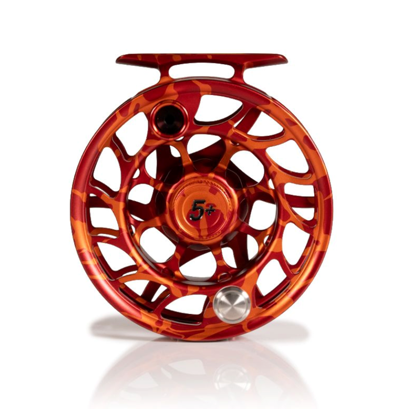 This limited edition run of custom Hatch Iconic 5 Plus fly reels Magma edition features a special red/orange splatter anodize with hand painted black fill accents and matching anodized handle and drag cap.
