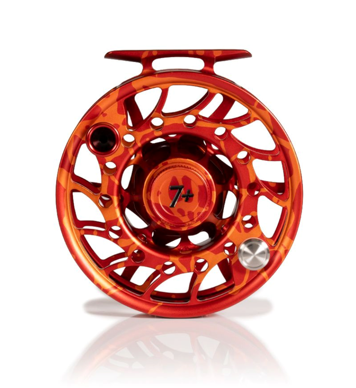 This limited edition run of custom Hatch Iconic 7 Plus fly reels Magma edition features a special red/orange splatter anodize with hand painted black fill accents and matching anodized handle and drag cap.