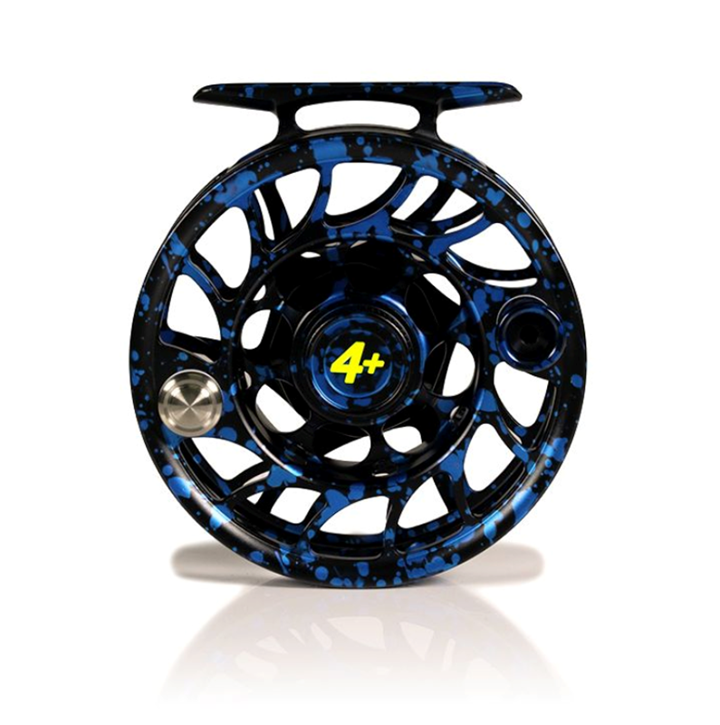 This limited edition run of custom Hatch Iconic 4 Plus fly reels Dark Matter edition features a special blue/black splatter anodize with hand painted acid green fill accents and matching anodized handle and drag cap.