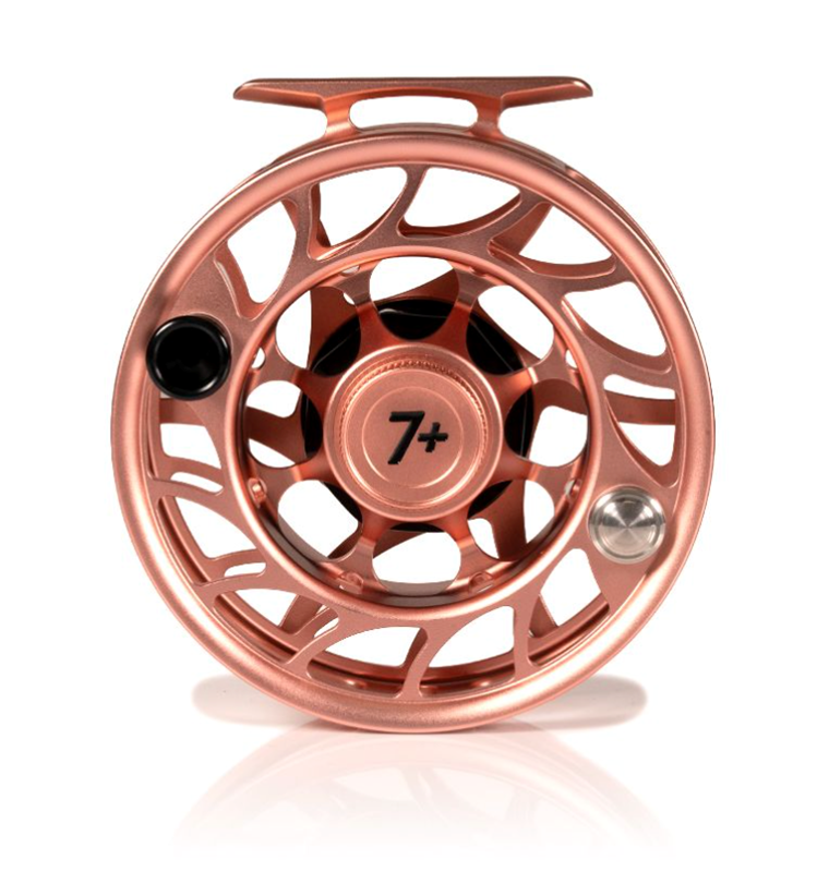 This limited edition run of custom Hatch Iconic 7 Plus fly reels Penny Dropper edition features a classic and beautiful copper anodize with hand painted black fill accents and matching anodized handle and drag cap.